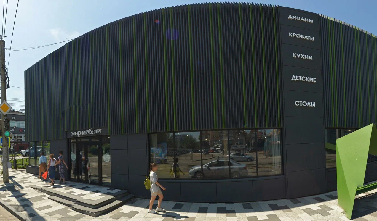 Само здание — типичный представитель торговой архитектуры «нулевых» с большими панорамными стеклами. Внутри это лабиринт из подиумов: общая площадь внушительная, и на нескольких этажах плотно упакованы десятки интерьерных решений — от классических дубовых столов до современного минимализма.